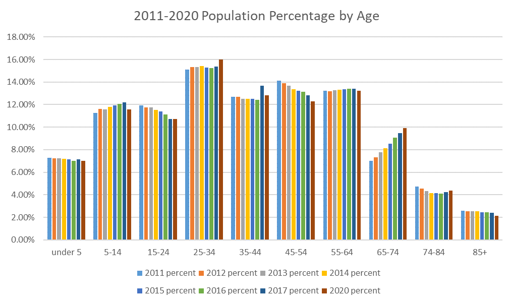 Looking at age brackets over time, one can see changes each year. Again, most of the profile for Roanoke is stable with the exception of the 64-74 bracket which show increases as the Baby Boomers’s cohort moves through. Also notable is the upward trend in the 5-14 age bracket and the downward trend of the 15-24 bracket. However, both changes are relatively slight.