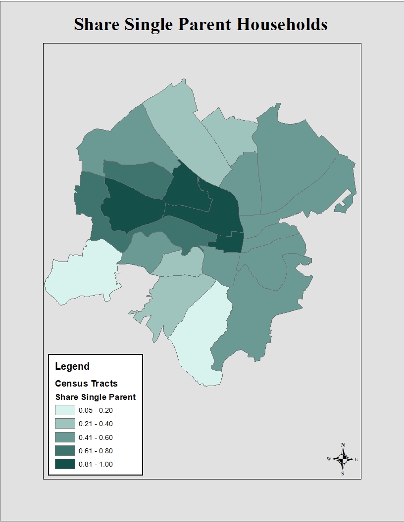 Studies have shown that two parent households are also an important factor when determining upward mobility. The map below shows the share of single parent households by census tract. The same areas that show lower incomes also have the largest share of single parent households. Upward mobility has been an issue that has been identified by various groups in Roanoke. It is important that issues such as upward mobility are recognized and addressed as the city plans for the next twenty years.